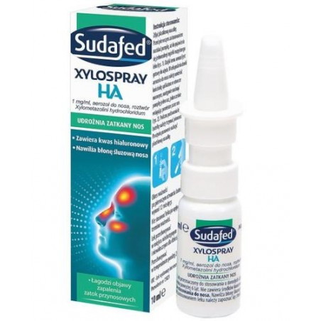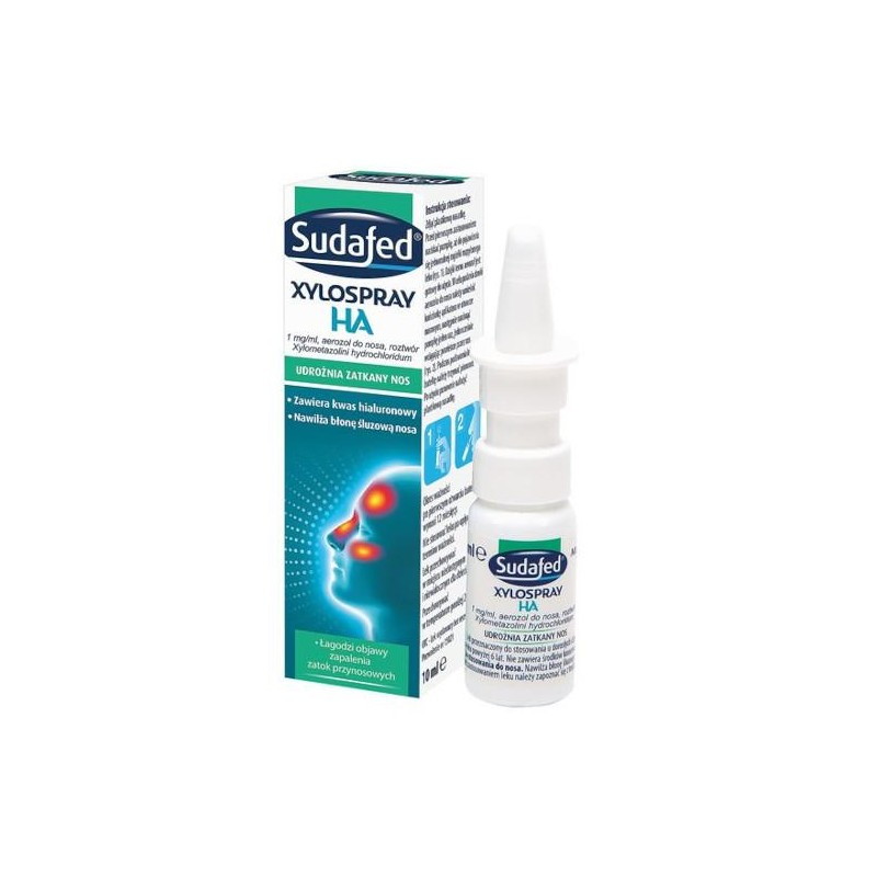 Ksylometazolina jest lekiem obkurczającym naczynia krwionośne, przez co zmniejsza obrzęk błony śluzowej nosa. Początek działania leku występuje zwykle w ciągu 5-10 minut po podaniu. Zmniejszenie obrzęku błony śluzowej ułatwia oddychanie przez nos oraz ułatwia odpływ wydzieliny. Lek Sudafed XyloSpray HA zawiera jako substancję pomocniczą kwas hialuronowy w postaci soli sodowej, który chroni i nawilża błonę śluzową nosa.