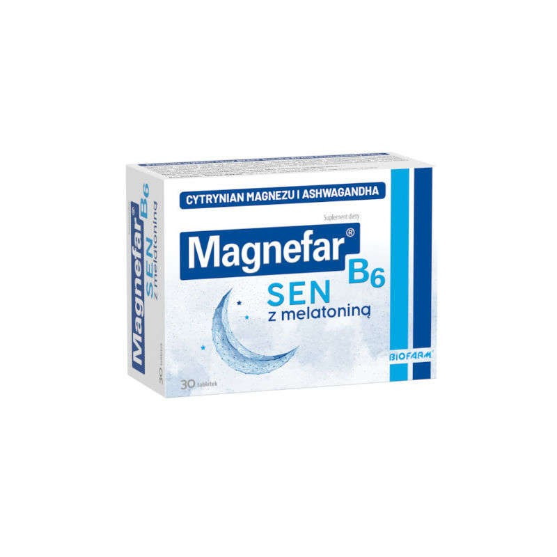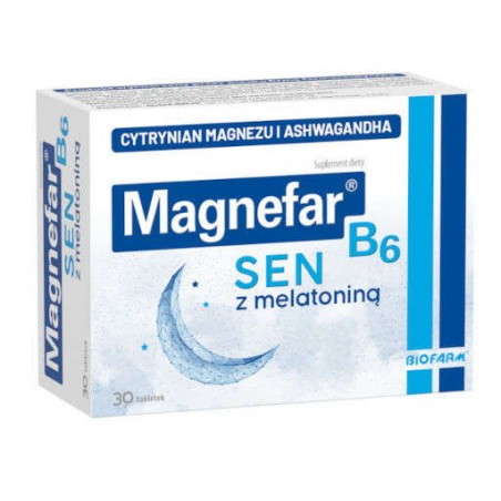 Magnefar® B6 Sen to suplement diety w postaci tabletek przeznaczony dla osób dorosłych. Zawiera w swoim składzie melatoninę, ekstrakt z korzenia ashwagandhy oraz magnez i witaminę B6.