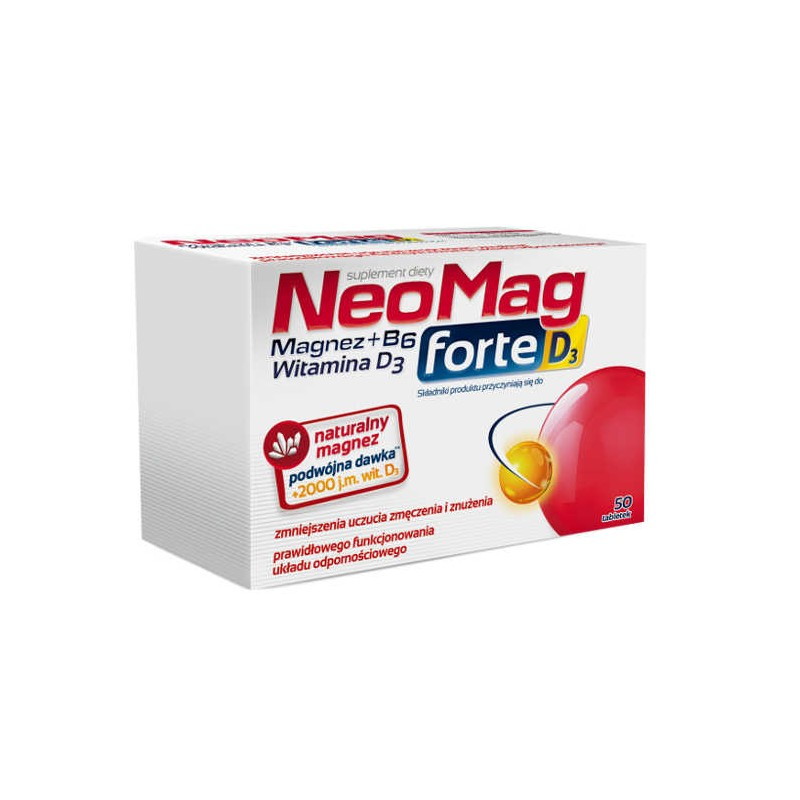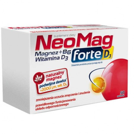 NeoMag Forte D3 - suplement diety zawierający wysoką dawkę magnezu wzbogacony witaminą D3. Produkt przeznaczony dla osób dorosłych.