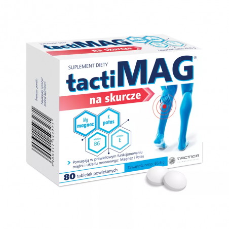Tactimag na skurcze to suplement diety, zawierający zestaw witamin i minerałów, których prawidłowy poziom wpływa korzystnie na prawidłową pracę mięśni (skurcze, rozkurcze), a także pomaga zredukować uczucie zmęczenia i ukoić nerwy.
