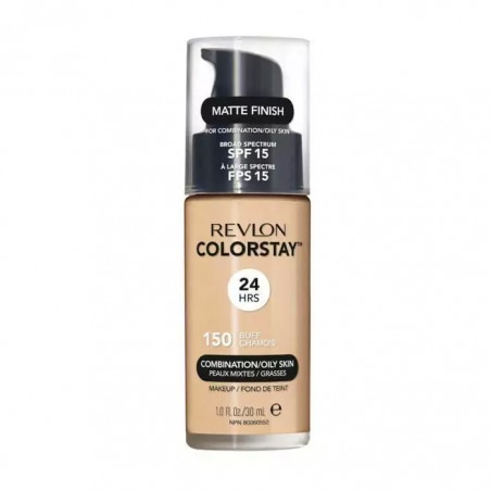 Revlon Colorstay cera mieszana tłusta, podkład z pompką 150 Buff zawiera bezolejową formułę, która nie zatyka porów i nie obciąża skóry twarzy, a zapewnia nieskazitelne matowe wykończenie. Dodatkowo, w celu ochrony skóry przed niekorzystnym działaniem promieni słonecznych zastosowano w nim filtry na poziomie SPF 15. Zawartość filtrów przeciwsłonecznych sprawia, że skóra twarzy chroniona jest przed działaniem promieni, które prowadzą do fotostarzenia się skóry.