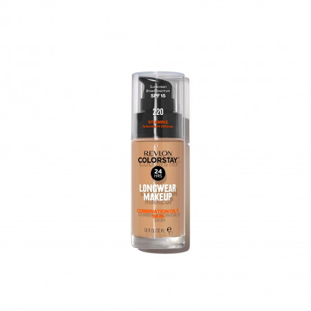Revlon Colorstay cera mieszana tłusta, podkład z pompką 220 zawiera bezolejową formułę, która nie zatyka porów i nie obciąża skóry twarzy, a zapewnia nieskazitelne matowe wykończenie. Dodatkowo, w celu ochrony skóry przed niekorzystnym działaniem promieni słonecznych zastosowano w nim filtry na poziomie SPF 15. Zawartość filtrów przeciwsłonecznych sprawia, że skóra twarzy chroniona jest przed działaniem promieni, które prowadzą do fotostarzenia się skóry.