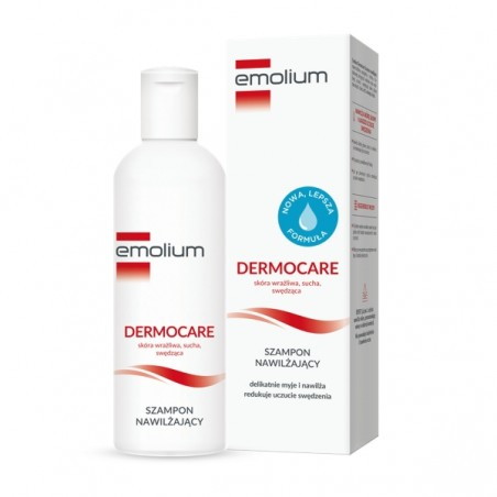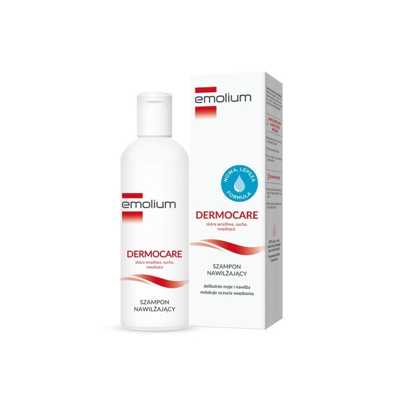 Emolium Dermocare szampon nawilżający został stworzony specjalnie z myślą o codziennej pielęgnacji włosów oraz wrażliwej, suchej i swędzącej skóry głowy dorosłych i dzieci od 1. miesiąca życia. Formuła z Kompleksem NMF, mocznikiem i betainą zapewnia wielokierunkowe i długotrwałe nawilżenie oraz ogranicza utratę wody z naskórka. Polidocanol łagodzi uczucie swędzenia suchej, podrażnionej skóry. Aminokwasy regenerują, wzmacniają i nawilżają włosy sprawiając, że stają się elastyczne i mocniejsze. Już po 1. Użyciu nawilża skórę, pozostawiając włosy w dobrej kondycji. Nie powoduje drażnienia i łzawienia oczu. Wysoki stopień tolerancji dla skóry. Przebadany Dermatologicznie. Opracowany we współpracy z Dermatologami.