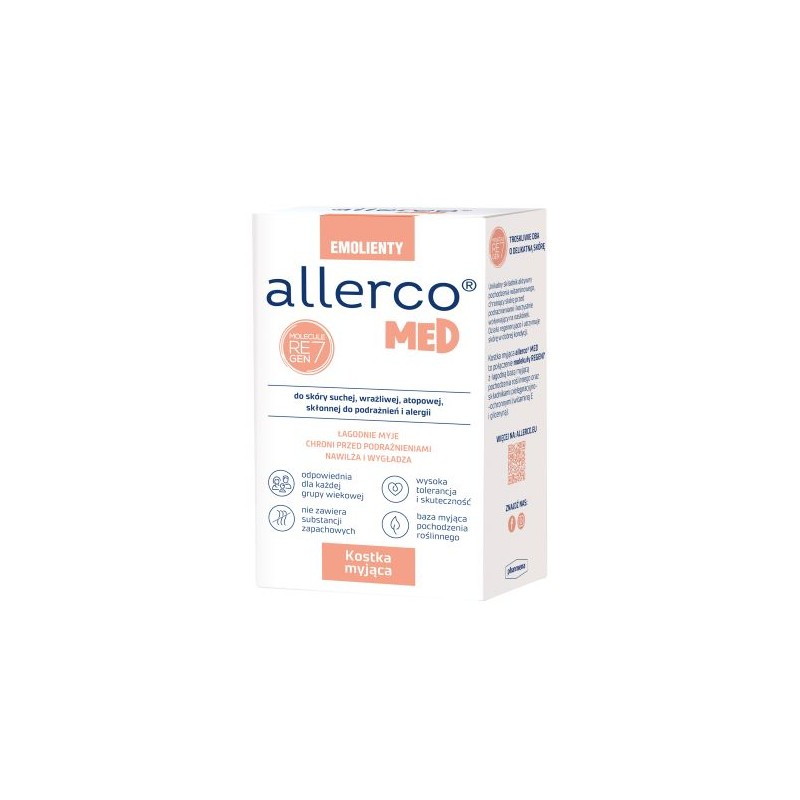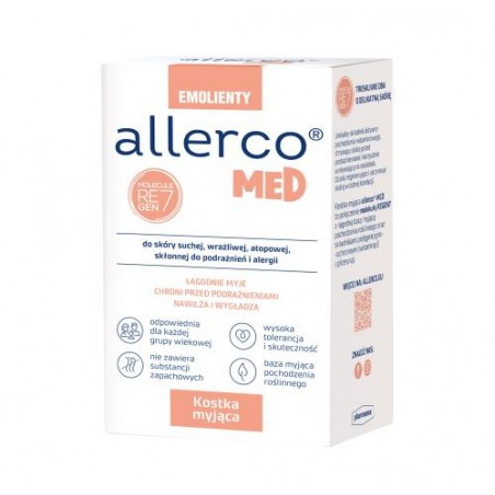 Kostka myjąca Allerco® przeznaczona jest do codziennego mycia twarzy i ciała. Używając ciepłej wody, wytworzyć pianę i wmasować w skórę. Spłukać wodą, po czym skórę delikatnie osuszyć ręcznikiem i nanieść preparat pielęgnacyjny z linii allerco®.