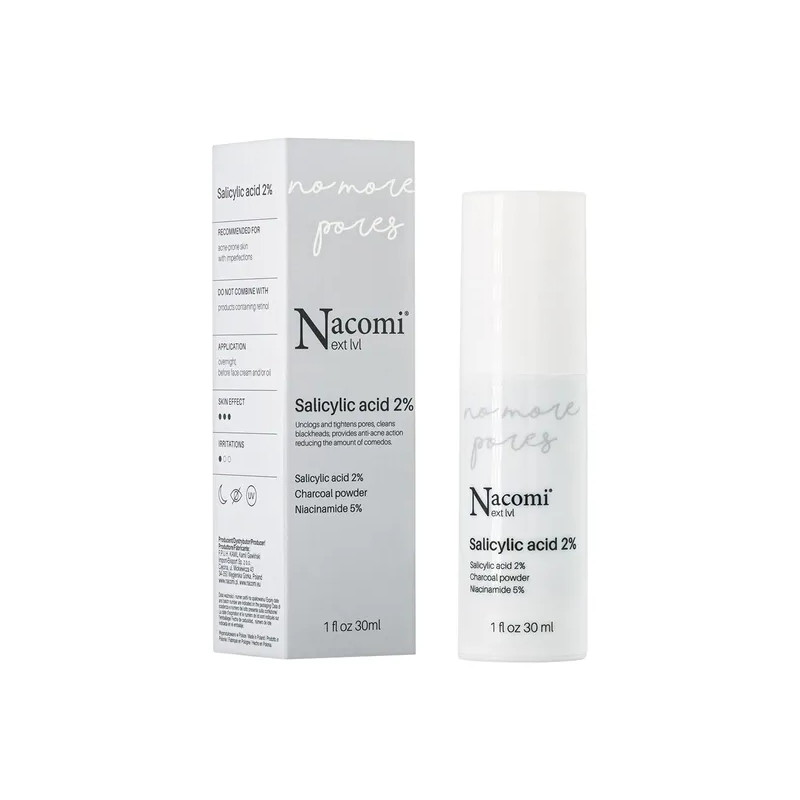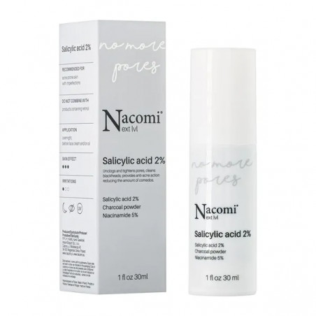 Serum No More Pores zawiera rozpuszczalny w tłuszczach kwas salicylowy w stężeniu 2%, który idealnie sprawdza się w pielęgnacji cery trądzikowej. Reguluje pracę gruczołów łojowych zmniejszając przetłuszczanie się skóry, dzięki czemu zmniejsza ryzyko tworzenia się zaskórników. Jego lipofilowy charakter ułatwia mu przenikanie przez naskórek i oczyszczenie porów z zalegających zanieczyszczeń. Kwas salicylowy sprawdza się również w terapii przebarwień, a w połączeniu z węglem aktywnym matuje i oczyszcza skórę. Zawarty w serum niacynamid łagodzi stany zapalne i zaczerwienienia, zmniejsza ilość wyprysków oraz produkcję sebum. Dodatkowo ogranicza produkcję melaniny zmniejszając przebarwienia oraz pobudza produkcje ceramidów przyczyniając się do poprawy nawilżenia i natłuszczenia skóry.