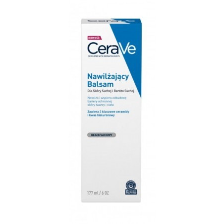 Balsam nawilżający do twarzy i ciała CeraVe 177 ml posiada unikalną, bogatą formułę pielęgnacyjną, która w kompleksowy sposób odpowiada na potrzeby przesuszonej i podrażnionej skóry.