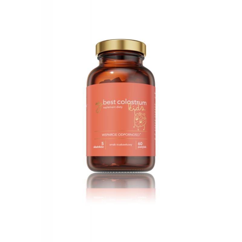 MyBestColostrum Kids to suplement diety w formie pastylek do ssania o truskawkowym smaku, stworzony z myślą o dzieciach od 3. roku życia. Zawiera colostrum bovinum, rutynę, witaminę C, cynk i ekstrakt z tymianku, które wspierają układ odpornościowy i oddechowy.