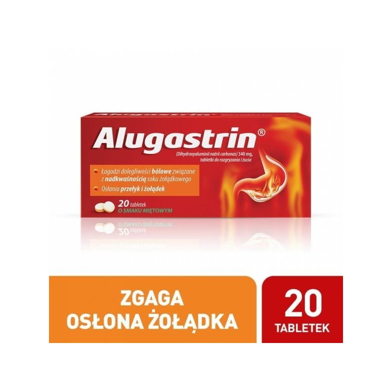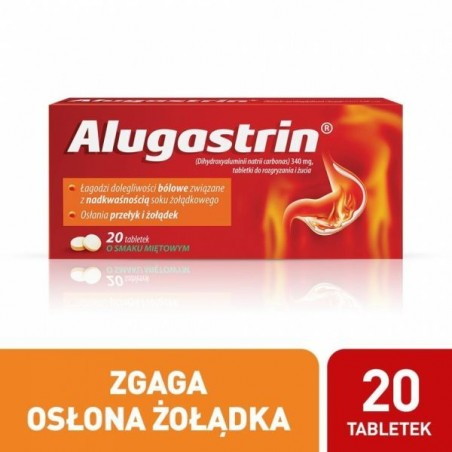 Tabletki do rozgryzania Alugastrin to lek na zgagę (nadkwaśność soku żołądkowego) oraz łagodzący uszkodzenia błony śluzowej żołądka i dwunastnicy. Alugastrin zobojętnia nadmiar kwasu solnego w soku żołądkowym, ale nie powoduje jego wtórnego pobudzenia. Produkt leczniczy przeznaczony do krótkotrwałego stosowania u dorosłych oraz dzieci w wieku powyżej 6 lat.