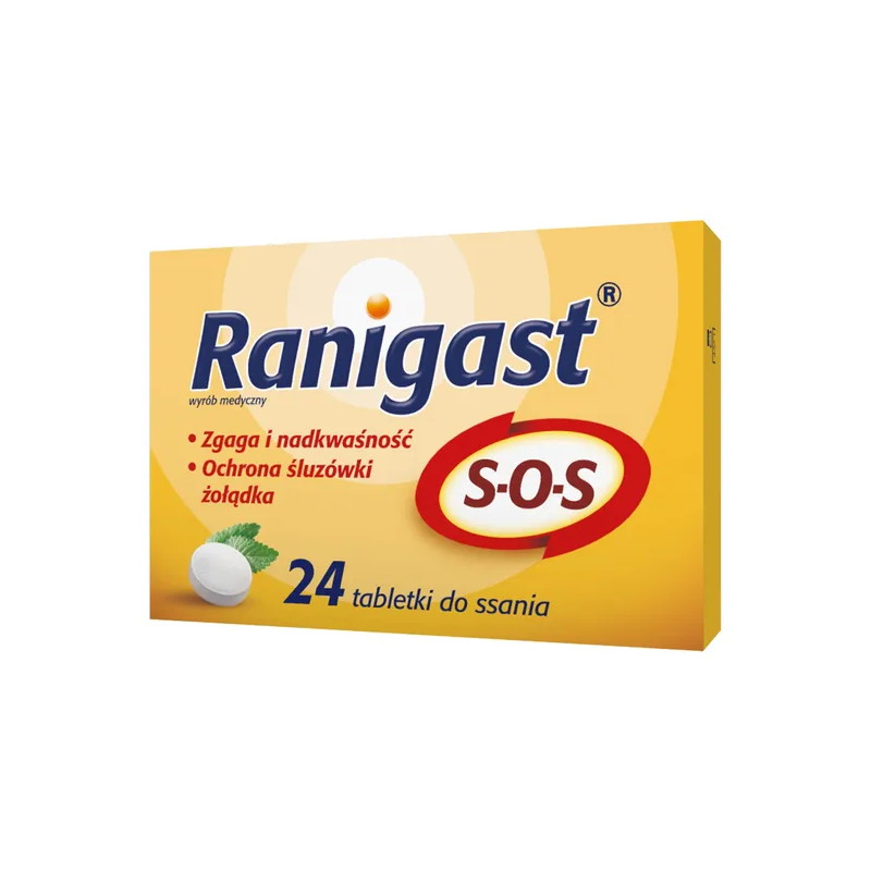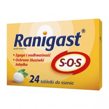 Ranigast S-O-S, tabletki do ssania wyrób medyczny, wskazany do stosowania w celu łagodzenia objawów refluksu żołądkowo-przełykowego, takich jak zgaga oraz ból w nadbrzuszu. Łagodzi nadkwaśność oraz chroni śluzówkę żołądka. Sole zobojętniające zawarte w produkcie neutralizują kwasotę soku żołądkowego, a alginiany tworzą warstwę ochronną na śluzówce żołądka, zmniejszając częstotliwość refluksu.