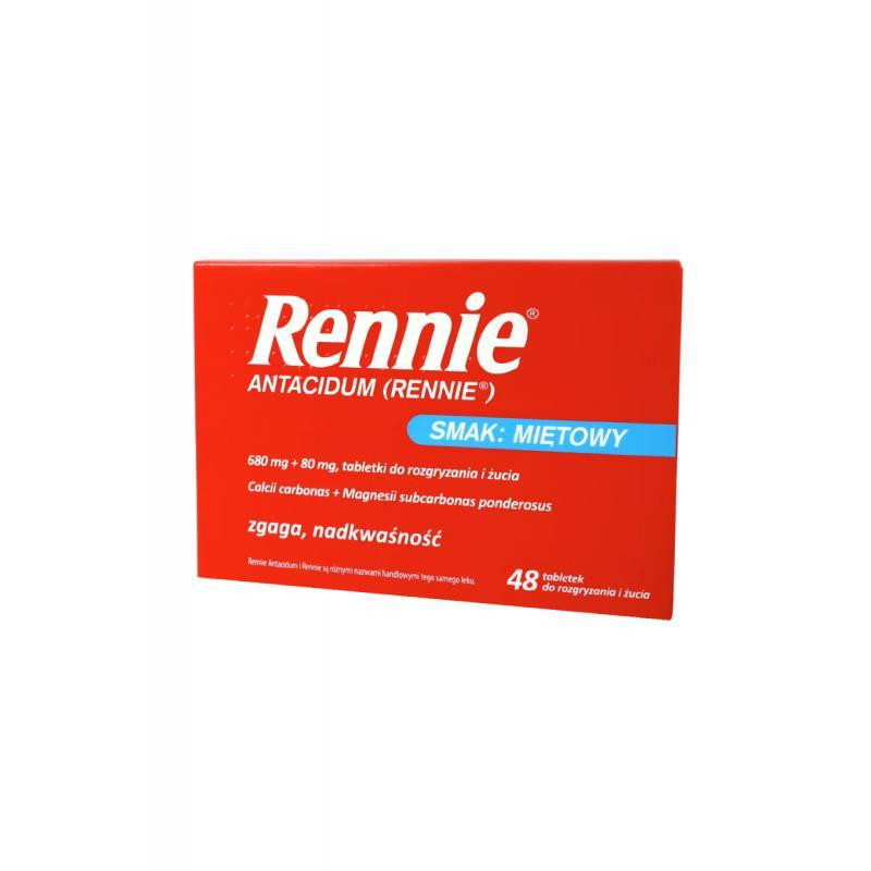 Rennie Antacidum to produkt leczniczy w postaci miętowych tabletek do żucia lub ssania. Jest przeznaczony do łagodzenia objawów związanych z nadkwaśnością soku żołądkowego, takich jak: zgaga, niestrawność, wzdęcia, nudności, odbijanie oraz uczucie pełności.
