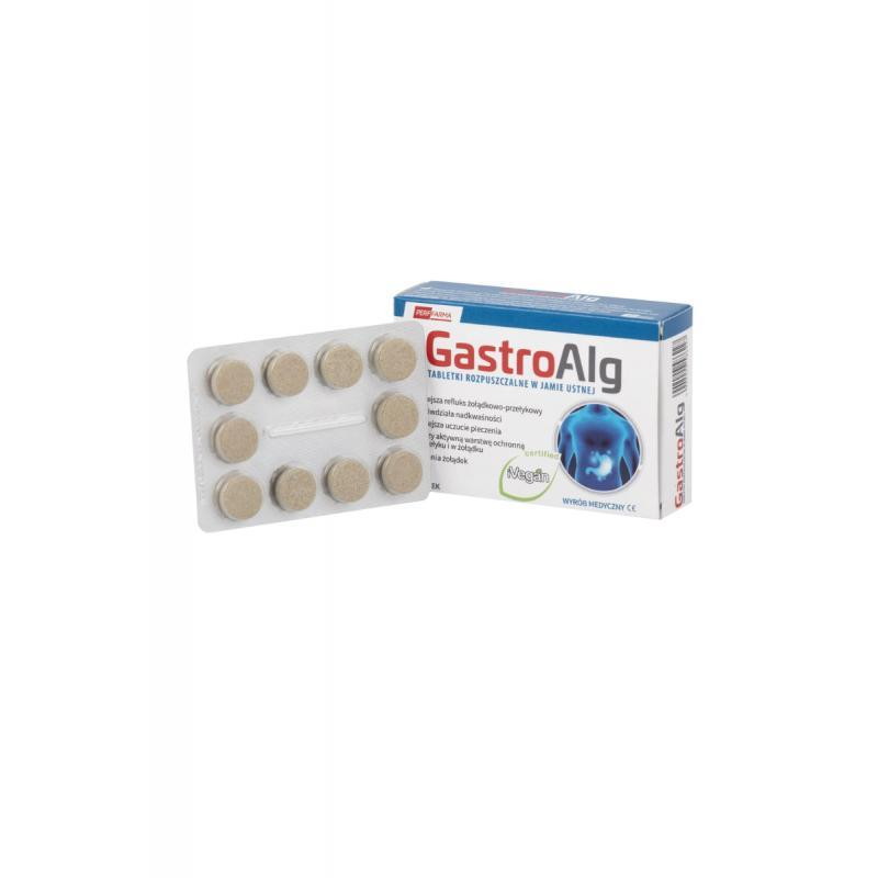 Gastroalg to wyrób medyczny w postaci rozpuszczalnych w jamie ustnej tabletek, który skutecznie zmniejsza objawy refluksu żołądkowo-przełykowego i podrażnień żołądka. Dzięki zawartości kwasu alginowego i ekstraktów roślinnych, tworzy ochronną barierę na błonie śluzowej, łagodząc pieczenie, ból i uczucie ciężkości w nadbrzuszu.