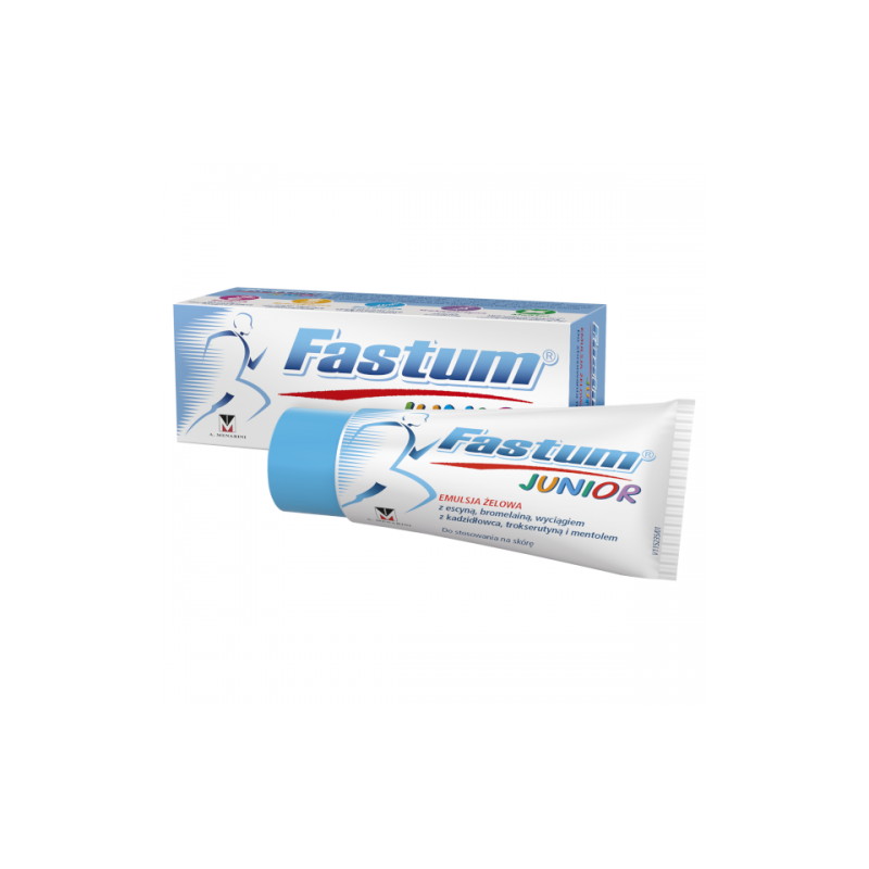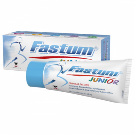 Fastum Junior emulsja żelowa z escyną, bromelainą, wyciągiem z kadzidłowca, trokserutyną i mentolem.