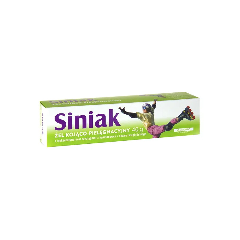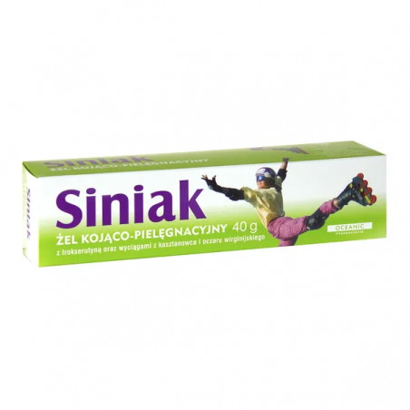 Siniak - Żel jest preparatem do stosowania na skórę. Preparat pomaga zmniejszyć skutki stłuczenia, takie jak siniaki i obrzęki. Dzięki zawartym w nim składnikom przyspiesza wchłanianie siniaków i zmniejsza obrzęk, który powstał po urazie. Lekka, delikatnie pachnąca konsystencja produktu łatwo się wchłania, a objawy urazu zostają złagodzone. Żel zawiera w swoim składzie aktywne składniki takie jak: ekstrakt z wąkroty azjatyckiej, ekstrakt z liści oczaru wirginijskiego, ekstrakt z kasztanowca, alantoina. W efekcie Siniak żel działa łagodząco na podrażnienia, wspomaga regenerację oraz niweluje skutki urazu, dzięki efektowi chłodzenia.