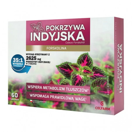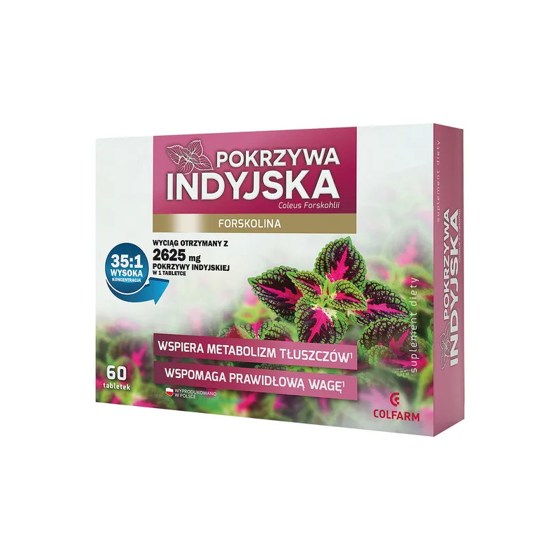 Pokrzywa indyjska (Coleus foskohlii) wspiera metabolizm tłuszczu w organizmie oraz jego magazynowanie, wspiera prawidłową masę ciała.