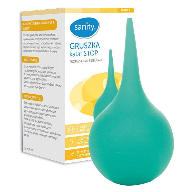 Gruszka do nosa Sanity dedykowana jest dla dzieci, które ukończyły 1. rok życia. Gruszka Katar Stop świetnie sprawdzi się do ręcznego oczyszczania nosa dziecka, zarówno podczas przeziębienia, jak i profilaktycznie. Zaokrąglona końcówka sprawia, że zabieg jest bezbolesny i komfortowy. Gruszka wykonana została z bezpiecznego materiału wolnego od ftalanów.