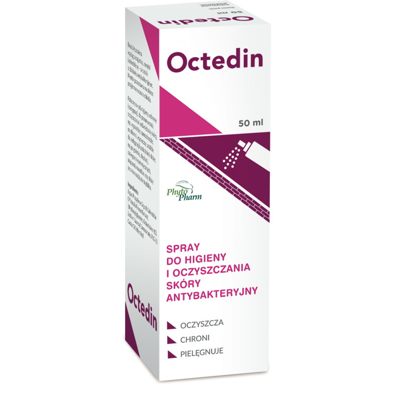 Octedin to płyn w formie sprayu do higieny i oczyszczania skóry. Produkt zawiera wyciąg z nagietka, znany ze swojego działania ochronnego, mentol, który odświeża skórę i pozostawia na niej przyjemne uczucie chłodu oraz oktenidynę - składnik o działaniu antybakteryjnym.