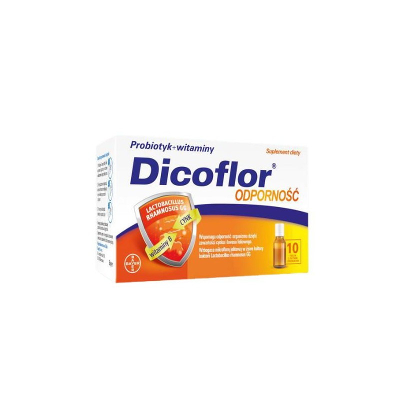 Dicoflor® Odporność to suplement diety w wygodnych do użycia fiolkach przeznaczony do uzupełniania codziennej diety dorosłych oraz dzieci w wieku 3 lat i starszych. Formuła zawiera w składzie żywe kultury bakterii Lactobacillus rhamnosus GG oraz dodatkowo witaminy z grupy B (tiaminę, ryboflawinę, niacynę, biotynę, kwas pantotenowy, kwas foliowy, B6, B12) i wysoką ilość cynku.