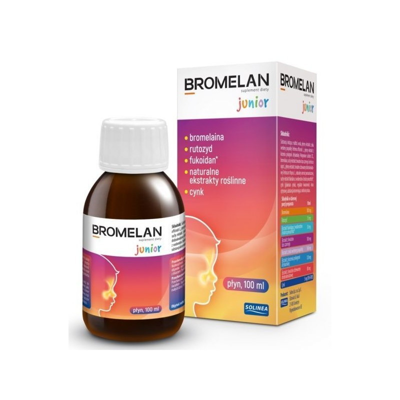 Bromelan junior to preparat dla dzieci uzupełniający codzienną dietę w naturalne składniki: bromelainę, rutozyd, ekstrakt fukoidanu z wodorostów Undaria pinnatifida, ekstrakty roślinne: z kwiatów bzu czarnego i dziewanny, ziela werbeny oraz korzenia pelargonii afrykańskiej, a także cynk.