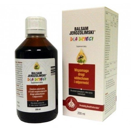 Balsam Jerozolimski dla dzieci zawiera unikalną kompozycję ziół stworzoną według zakonnej receptury. Naturalne składniki preparatu wspierają pracę układu oddechowego i odpornościowego. Suplement diety jest przeznaczony dla dzieci od 3 roku życia oraz dla dorosłych.