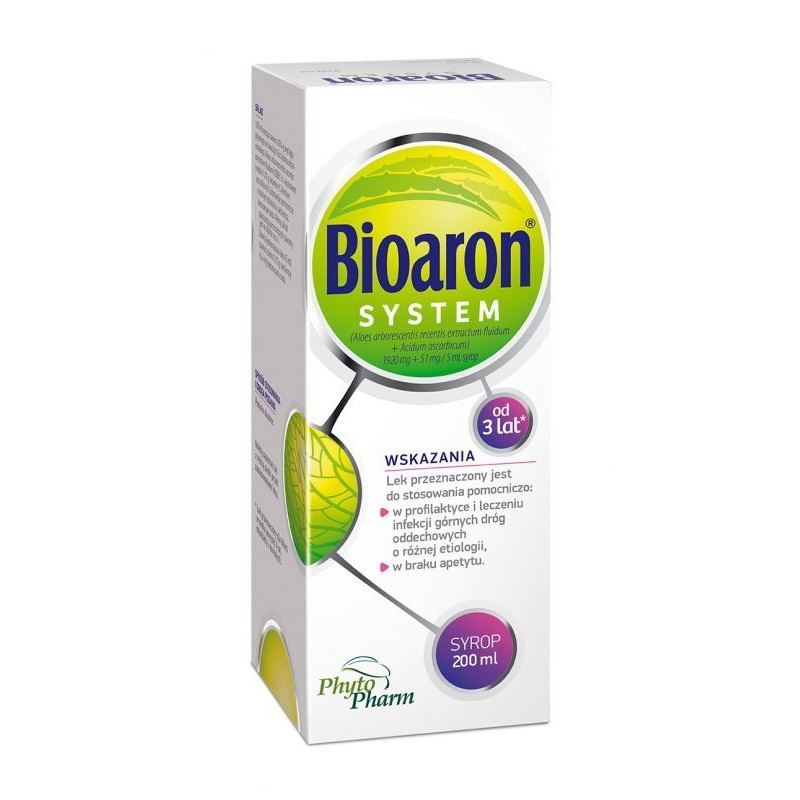 Bioaron System (Bioaron C) to produkt leczniczy, który wspomaga leczenie oraz profilaktykę infekcji górnych dróg oddechowych a także pobudza apetyt. Lek zawiera wyciąg z aloesu drzewiastego oraz witaminę C i można go stosować u dorosłych a także dzieci w wieku powyżej 3 lat.