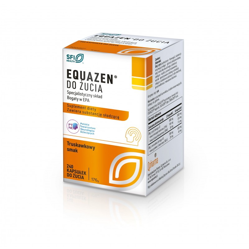 Equazen do żucia - suplement diety z kwasami omega pochodzącymi z oleju z ryb morskich oraz z wiesiołka. Produkt przeznaczony dla dzieci oraz osób dorosłych. EQUAZEN® posiada Rekomendację Polskiego Towarzystwa Neurologów Dziecięcych i nie zawiera: sztucznych barwników, środków konserwujących, laktozy, soi ani glutenu.