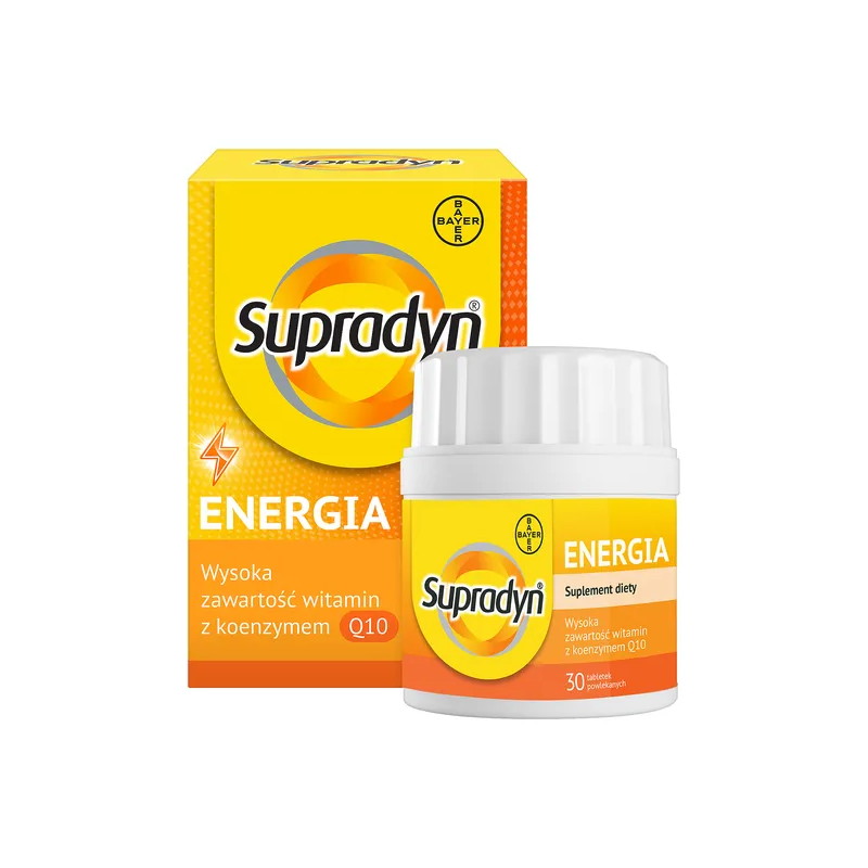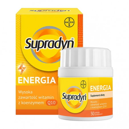 Supradyn Energia - suplement diety, zawierający zestaw witamin i minerałów z koenzymem Q10. Produkt przeznaczony dla osób dorosłych.