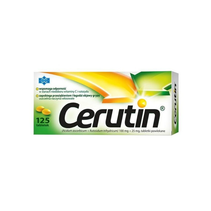 Polfarmex Cerutin 100 mg + 25 mg to lek w postaci żółtych, obustronnie wypukłych tabletek powlekanych. Przeznaczony jest dla dorosłych, młodzieży i dzieci, które potrafią połknąć tabletkę. Preparat zawiera witaminę C oraz przedłużający jej działanie (poprzez opóźnienie utleniania się kwasu askorbowego) rutozyd. Składniki aktywne leku zmniejszają przepuszczalność i wzmacniają ścianę naczyń krwionośnych.