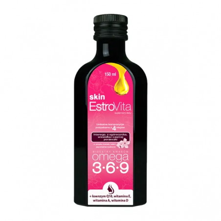 EstroVita Skin Sakura - to suplement diety zawierający nienasycone kwasy tłuszczowe, koenzym Q10 oraz witaminy E, A, D. Produkt przeznaczony dla osób dorosłych.