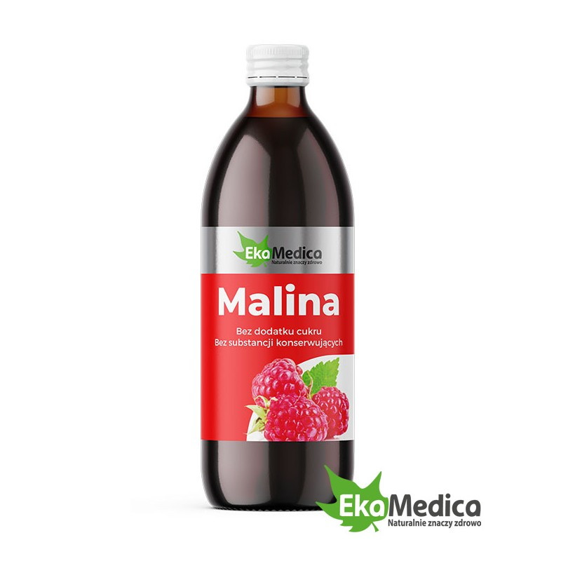 Malina - suplement diety w formie płynnej, wyprodukowany z soku 100% z owoców malin z dodatkiem naturalnej witaminy C pochodzącej z ekstraktu z owoców camu camu. Pasteryzowany.