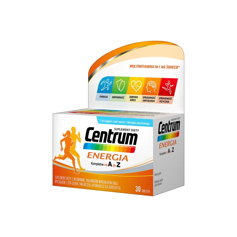Centrum Energia - to suplement diety zawierający witaminy, minerały oraz wyciąg z miłorzębu japońskiego i żeń-szenia. Produkt przeznaczony dla osób dorosłych.