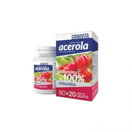 Acerola Grinovita – suplement diety w postaci tabletek do ssania zawierający naturalną witaminę C pochodzącą z aceroli. Produkt przeznaczony dla dzieci od 3. roku życia i dorosłych. Bez glutenu, bez cukru, odpowiedni dla wegetarian i wegan.