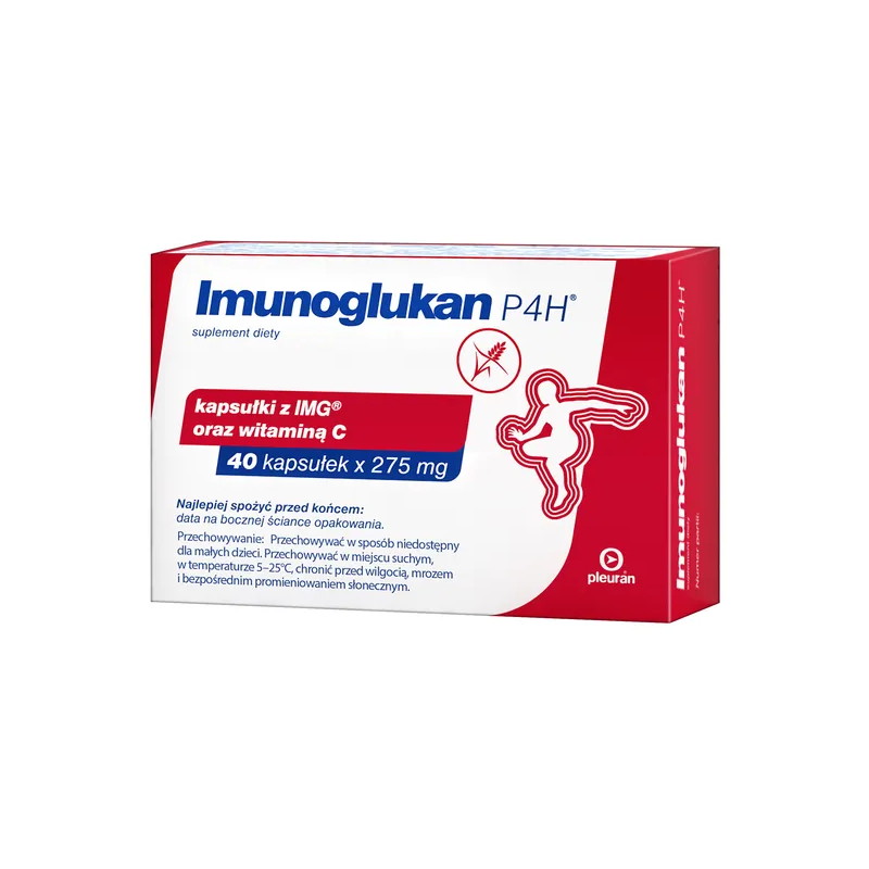 Imunoglukan P4H® kapsułki 40 szt. - to suplement diety, który zawiera opatentowaną substancję IMG®, która jest występującym w naturze biologicznie aktywnym polisacharydem oraz witaminę C. IMG® jest starannie oczyszczoną substancją pochodzenia naturalnego, uzyskaną przez izolację z boczniaka ostrygowatego (Pleurotus ostreatus). Produkt przeznaczony dla osób dorosłych.