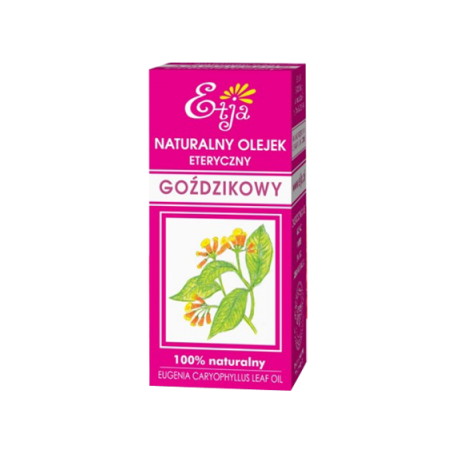 Naturalny olejek eteryczny goździkowy marki Etja to produkt kosmetyczny, który pochodzi z pąków kwiatowych drzewa goździkowego uprawianego głównie na Zanzibarze, Pemba i Madagaskarze. Olejek goździkowy pomaga pobudzać umysł. Z uwagi na aromat i skład wspomaga odstraszanie owadów, a zwłaszcza meszek, więc może być stosowany jako naturalny repelent. Składnikiem aktywnym olejku jest eugenol, który wspiera działania bakteriobójcze.