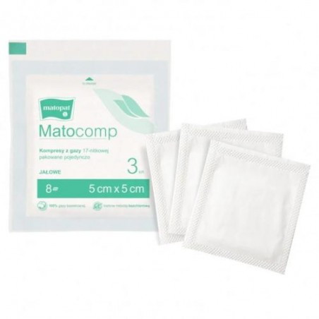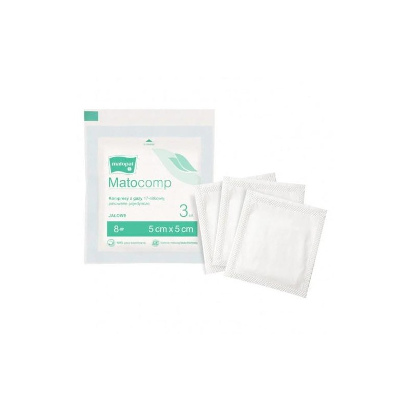 Kompresy z gazy opatrunkowej Matocomp 17 nitkowe, o wymiarach 5 x 5 cm. Warstwowość = 12.