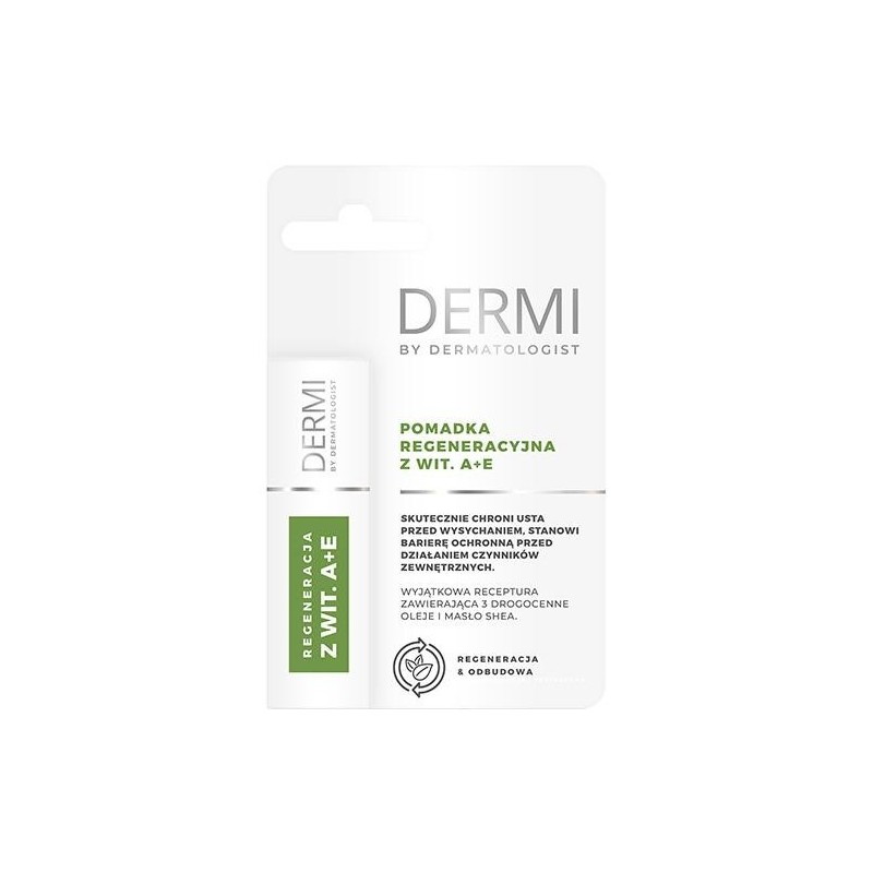 Dermi by dermatologist pomadka regeneracyjna w witaminami A+E to produkt kosmetyczny, którego składniki chronią i nawilżają usta.
