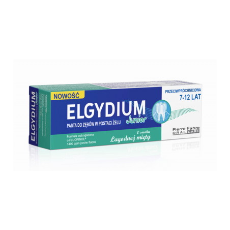 Elgydium Junior to pasta w postaci żelu, przeciwpróchnicza o smaku łagodnej mięty. Wzmacnia stałe zęby u dzieci od 7 do 12 roku życia. Łagodnie myje zęby, nie podrażniając dziąseł oraz szkliwa. Zawiera odpowiednią ilość fluorku dostosowaną do potrzeb tej grupy wiekowej (1400 ppm jonów fluorkowych).