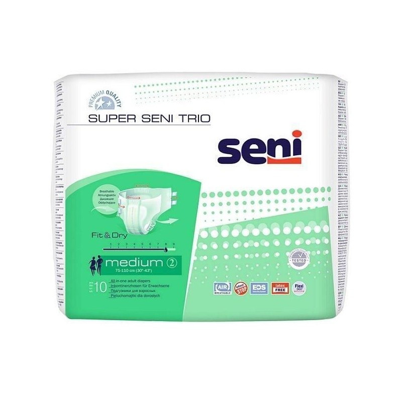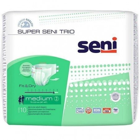 Super Seni Trio to klasyczne, uniwersalne pieluchomajtki, zaprojektowane tak, aby zapewnić maksymalny komfort użytkowania. Produkt wykonany został z materiałów umożliwiających skórze swobodne oddychanie, natomiast elementy z elastycznej przędzy zmniejszają ryzyko powstawania reakcji alergicznych. Wykorzystane do produkcji specjalne włókna Extra Dry System zapewniają bardzo szybką dystrybucję wilgoci wewnątrz wkładu gwarantując utrzymanie suchości. Ponadto superabsorbent znajdujący się w wyrobie wykazuje działanie antybakteryjne - ogranicza rozwój bakterii odpowiedzialnych za nieprzyjemny zapach. Elastyczny ściągacz taliowy oraz przylepcorzepy sprawiają, że wyrób dobrze dostosowuje się do kształtów cała, zapewniając dyskrecję użytkowania, natomiast osłonki boczne wykonane z hydrofobowej włókniny dodatkowo zabezpieczają przed przeciekaniem. Produkt posiada także wmontowany wskaźnik wilgotności informujący o konieczności zmiany pieluchomajtek.