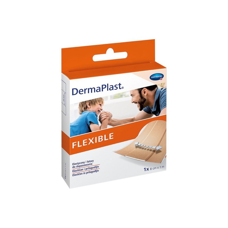 Plastry Dermaplast Flexible elastyczne do cięcia. Plaster jest idealny do ruchomych części ciała, gdyż wykonany został ze sprężystego i rozciągliwego materiału, który bardzo dobrze dopasowuje się do kształtu ciała. Bardzo dobrze sprawdza się u osób aktywnych, gdyż nie odkleja się przy poruszaniu, przy tym nie ograniczając ruchów. Plastry nie przywierają do ran i odrywają się bezboleśnie.