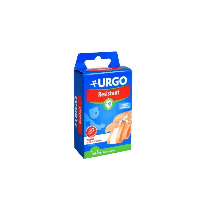 URGO Resistant to elastyczny, włókninowy plaster w taśmie 1 m x 6 cm, nasączony roztworem antyseptycznym, o działaniu antybakteryjnym. Opatrunek Urgo Resistant: jest odporny i wytrzymały, został wykonany z rozciągliwej tkaniny, zapewnia ochronę antybakteryjną, pozwala skórze oddychać, dzięki mikrowentylacyjnej warstwie, nie przywiera i nie przykleja się do rany, jest elastyczny i zapewnia komfort w poruszaniu, jest wygodny w użyciu, można go przycinać nożyczkami, aby dopasować do każdej rany, niezależnie od wielkości.