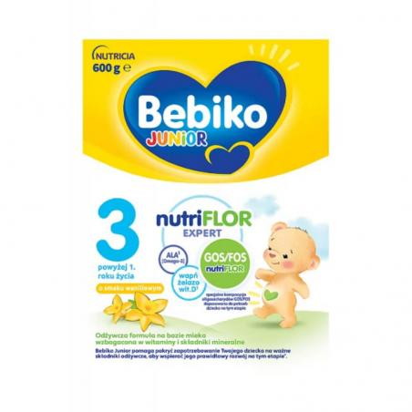 Bebiko Junior 3 NUTRIflor Expert, odżywcza formuła na bazie mleka o smaku waniliowym, powyżej 1. roku życia posiada wysoką jakość składników oraz unikalną kompozycję GOS/FOS. Zgodnie z przepisami prawa, tak jak inne mleka następne zawiera kompletną kompozycję składników dla wsparcia prawidłowego rozwoju i układu odpornościowego wzbogaconą o DHA, ALA, witaminy A, C, D, a także wapń, żelazo i jod. Także zgodnie z przepisami prawa nie zawiera konserwantów, barwników i wzmacniaczy smaku. Bez oleju palmowego.