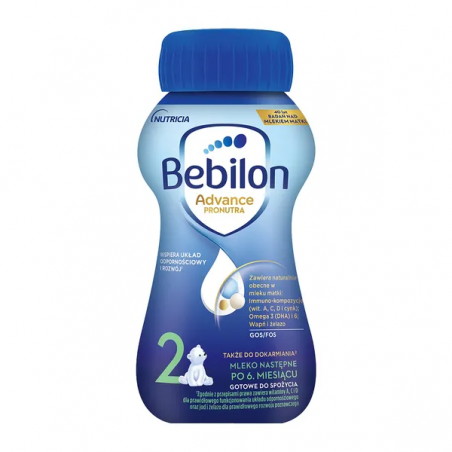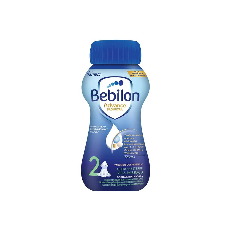 Dietetyczny środek spożywczy specjalnego przeznaczenia medycznego Bebilon 2 z Pronutra Advance 200 ml postaci płynnej jest produktem gotowym do bezpośredniego podania dziecku. Mleko następne Bebilon 2 z Pronutra Advance 200 ml przeznaczone jest dla dzieci od 6. miesiąca życia. Dzięki dostępności w płynnej formie można skorzystać z niego przy ograniczonych możliwościach przyrządzania mieszanki z proszku i wody. Takie rozwiązanie sprawdzi się zatem podczas przebywania poza domem, ale również bywa wygodną opcją w warunkach domowych – m.in. do szybkiego nakarmienia dziecka w nocy.