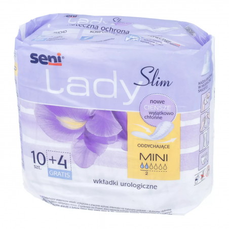 Wyrób medyczny SENI LADY SLIM wkładki urologiczne MINI PLUS w rozmiarze 9,5 x 22,5 cm.