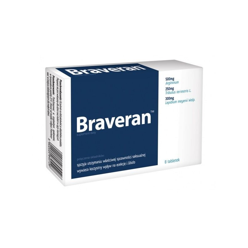 Braveran™ to suplement diety w postaci tabletek, którego skład został dobrany specjalnie z myślą o utrzymaniu zdrowia seksualnego mężczyzn. Formuła produktu opiera się na naturalnych składnikach pochodzenia roślinnego takich jak buzdyganek naziemny, maca, żeń-szeń i szafran i dodatkowo została uzupełniona o cynk, selen, witaminę E oraz L-argininę.