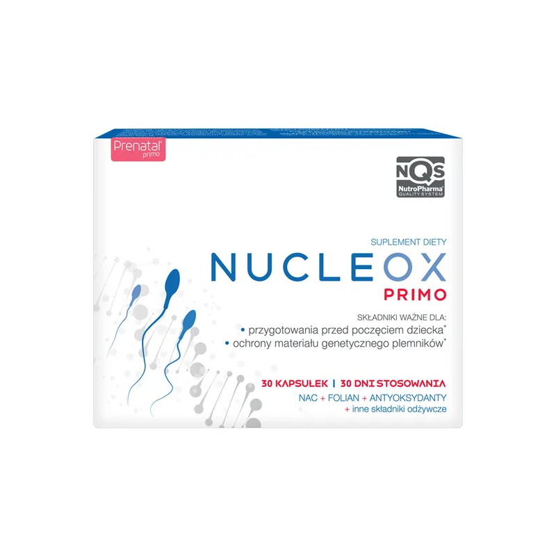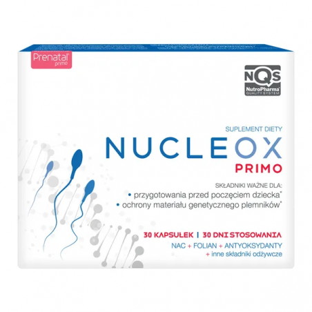 NutroPharma Nucleox Primo - suplement diety w postaci kapsułek, który zawiera NAC, witaminy B6 i B9, cynk, selen oraz dwuwinian choliny. Produkt przeznaczony dla dorosłych mężczyzn.