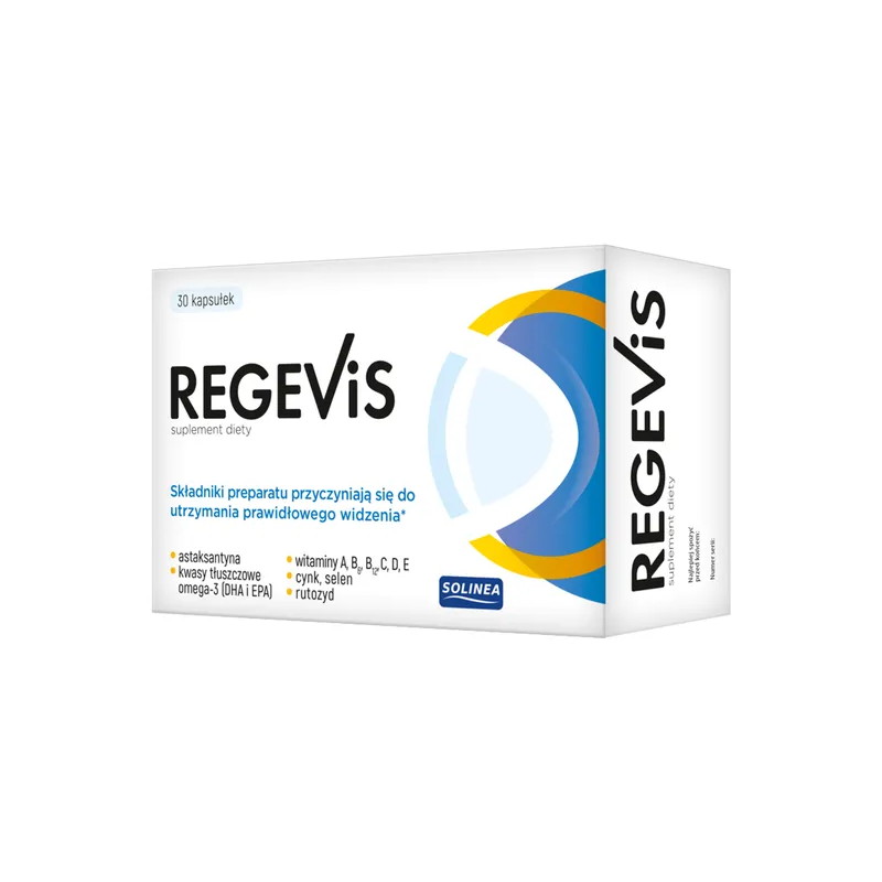 Regevis - suplement diety zawierający składniki uzupełniające codzienną dietę w składniki odżywcze najwyższej jakości, które wspomagają utrzymanie prawidłowego widzenia oraz chronią komórki przed stresem oksydacyjnym. Produkt przeznaczony dla osób dorosłych.