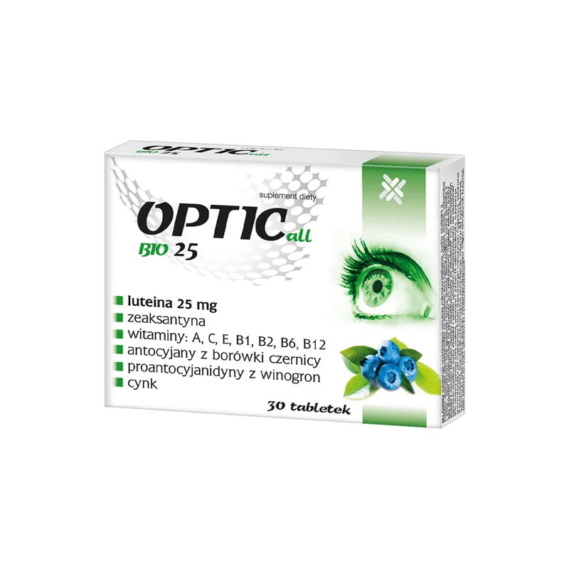 OPTICall BIO25 - suplement diety, który zawiera witaminy i składniki roślinne, rekomendowany osobom pragnącym zadbać o wzrok. Produkt posiada formę tabletek i jest przeznaczony dla osób dorosłych.