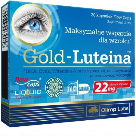 Gold-Luteina to suplement diety w postaci kapsułek płynnych Flow Caps, zawierający skoncentrowany olej rybi standaryzowany na zawartość kwasu dokozaheksaenowego (DHA) z grupy kwasów omega-3 oraz wysokiej jakości luteinę i zeaksantynę z aksamitki wyniosłej (Tagetes erecta L.) oraz cynk w formie innowacyjnych peletek, a także witaminę A i E. Technologia płynna z peletkami zapewnia szybkie wchłanianie i biodostępność składników aktywnych. Twarda kapsułka żelatynowa zabezpiecza przed utlenianiem składników aktywnych. Cynk, witamina A i kwas DHA przyczyniają się do utrzymania prawidłowego widzenia. Korzystne działanie występuje w przypadku spożywania 250 mg DHA dziennie.