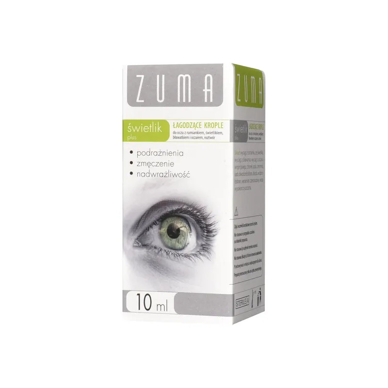 ZUMA Świetlik plus są kroplami do oczu, które dzięki odświeżającym i kojącym właściwościom rumianku, świetlika, bławatka i oczaru łagodzą podrażnienia i zaczerwienienia oczu spowodowane zbyt długą pracą przy komputerze, wysiłkiem sportowym, działaniem czynników zewnętrznych, takich jak: wiatr, słońce, suche powietrze, słona woda, dym, kurz, zwiększone nasłonecznienie.