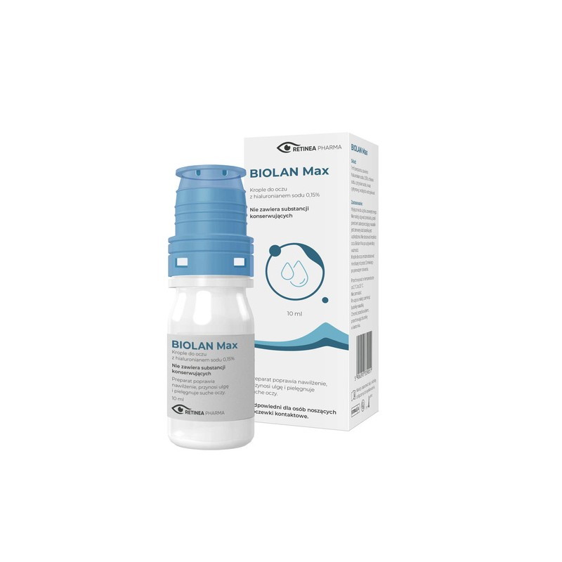 Biolan Max to jałowy preparat o wysoko elastycznych właściwościach, wytwarzający ochronną warstwę na powierzchni rogówki. Nawilżające krople do oczu Biolan Max zawierają hialuronian sodu, sól sodową kwasu hialuronowego.