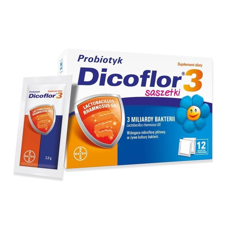 Dicoflor 3 - suplement diety z 3 mld żywych bakterii probiotycznych Lactobacillus rhamnosus GG (ATCC 53103). Produkt przeznaczony dla dzieci oraz niemowląt.